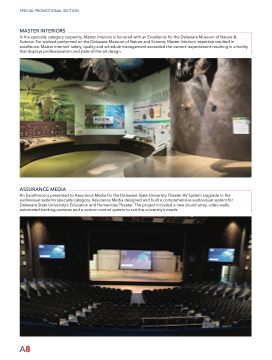 An Excellence is presented to Assurance Media for the Delaware State University Theater AV System Upgrade in the audiovisual systems specialty category. Assurance Media designed and built a comprehensive audiovisual system for Delaware State University’s Education and Humanities Theater. The project included a new sound array, video walls, automated tracking cameras and a custom control system to suit the university’s needs.