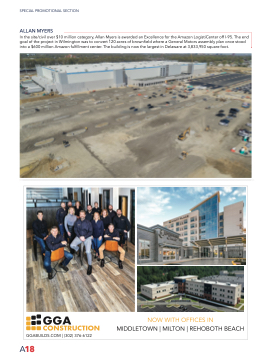 In the site/civil over $10 million category, Allan Myers is awarded an Excellence for the Amazon LogistiCenter off I-95. The end goal of the project in Wilmington was to convert 120 acres of brownfield where a General Motors assembly plan once stood into a $600 million Amazon fulfillment center. The building is now the largest in Delaware at 3,833,950 square foot.