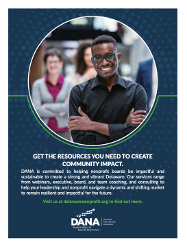 DANA is committed to helping nonprofit boards be impactful and sustainable to create a strong and vibrant Delaware. Our services range from webinars, executive, board, and team coaching, and consulting to help your leadership and nonprofit navigate a dynamic and shifting market to remain resilient and impactful for the future.