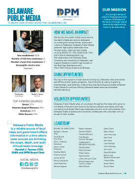 to covering the unique issues, events and culture of Delaware. Delaware Public Media presents high-quality statewide news through audio, video and text media,