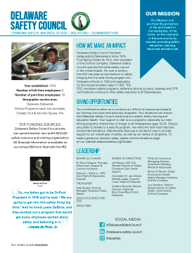 Delaware Safety Council is a private, non-governmental, non-profit 501(c)(3) safety resource and training organization. All financial information is available on our annual 990 form filed with the IRS.