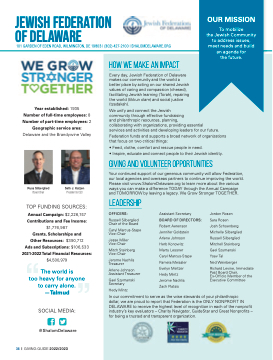 Your continued support of our generous community will allow Federation, our local agencies and overseas partners to continue improving the world. Please visit www.ShalomDelaware.org to learn more about the various ways you can make a difference TODAY through the Annual Campaign and TOMORROW by leaving a legacy. We Grow Stronger TOGETHER.