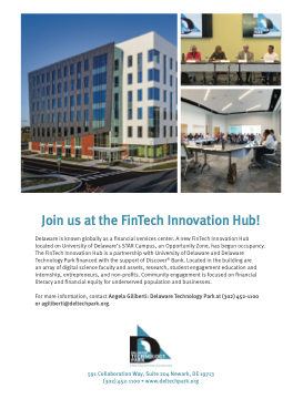 Delaware is known globally as a financial services center. A new FinTech Innovation Hub located on University of Delaware’s STAR Campus, an Opportunity Zone, has begun occupancy. The FinTech Innovation Hub is a partnership with University of Delaware and Delaware Technology Park financed with the support of Discover® Bank. Located in the building are