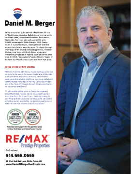 Danny is honored to be named a Real Estate All Star by Westchester Magazine. Building on a long career in corporate sales, Danny transitioned to Westchester oreal estate five years ago and opened his own RE/MAX brokerage in White Plains in 2019. Danny excels in customer service, making himself available around-the-clock to expertly guide his clients through every step of the buying and selling process, whether it is matching them with their dream homes and investment properties or helping them sell at the best price. In 2022, “RateMyAgent” ranked Danny “Agent of the Year” for Westchester County and New York State.