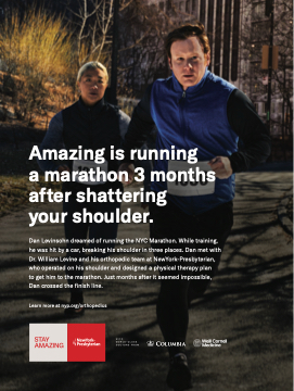 Dan Levinsohn dreamed of running the NYC Marathon. While training, he was hit by a car, breaking his shoulder in three places. Dan met with Dr. William Levine and his orthopedic team at NewYork-Presbyterian, who operated on his shoulder and designed a physical therapy plan