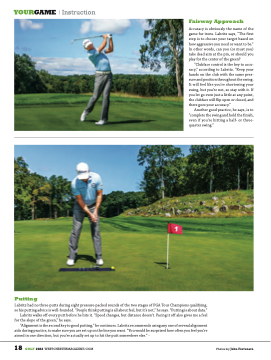 “Clubface control is the key to accu- racy,” according to Labritz. “Keep your hands on the club with the same pres- sure and position throughout the swing. It will feel like you’re shortening your swing, but you’re not, so stay with it. If you let go even just a little at any point, the clubface will flip open or closed, and there goes your accuracy.”