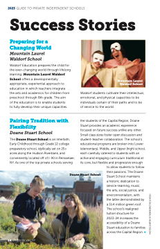 the students of the Capital Region, Doane Stuart provides an academic experience focused on future success unlike any other. Small class sizes foster open discussion and student-teacher collaboration. The school’s educational programs are broken into Lower (elementary), Middle, and Upper (high) school, each carefully catered to students with an active and engaging curriculum traditional at its core, but flexible and progressive enough