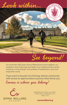 For more than 200 years, Emma Willard School has instilled in our students a love of learning, the habits of an intellectual life, and the character, moral strength, and qualities of leadership to serve and shape their world.