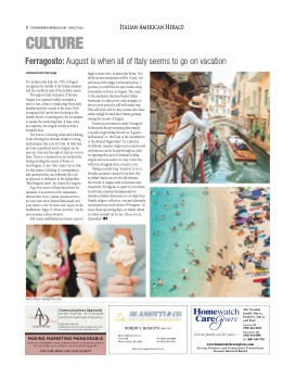 the month of August with excitement and enjoyment. Ferragosto is a part of our culture. It embodies essential fundamentals we cherish as Italian Americans in our daily lives. Family, religion, reflection, rest and ultimately rejuvenation are at the heart of Ferragosto. So enjoy these upcoming days, no matter where you find yourself. As for me, I’ll see you in September! IAH