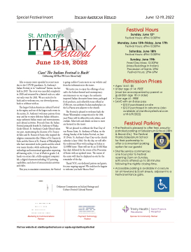 Like so many events upended in recent years due to the COVID pandemic, St. Anthony’s Italian Festival, in its “traditional” format, was last held in 2019. The event was cancelled completely in 2020 and returned for a limited scale as a take- out-only event for 2021. We are excited to be back and to welcome you, our devoted patrons, back to celebrate with us.