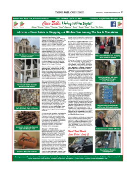 Bookings accepted Tweens to Seniors: “Building Bridges, Connecting People: Tales on Culture, Heritage & Traditions” “Adventures In Abruzzo: An Exhibit & Video Presentation” Local to International Public Relations, Television, Social Media, Newspapers & Events Contact CiaoBellaLivingItalianStyle@gmail.com