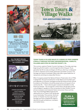 TOWN TOURS & VILLAGE WALKS IS A SERIES OF FREE SUMMER STROLLS THROUGH HISTORIC NEIGHBORHOODS, HAMLETS, VILLAGES AND SITES IN CHESTER COUNTY, PA.