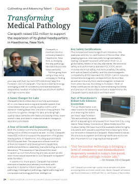 which is appealing to employees from New York City, Long Island, New Jersey, Connecticut, Westchester and the Hudson Valley. We have found the available talent is highly educated, with valuable expertise that is helping to drive our innovation forward at Clarapath. Westchester’s robust life sciences ecosystem and strong healthcare sector are also important to our ongoing business growth.”