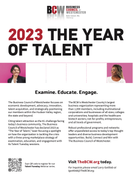 Citing talent attraction as the #1 challenge facing todayʼs business community, The Business Council of Westchester has declared 2023 as “The Year of Talent,” laser-focusing a spotlight on how the organization is tackling the crisis with a three-prong marketplace strategy of examination, education, and engagement with its Talent Tuesday sessions.