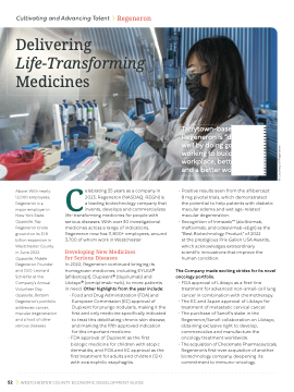 Celebrating 35 years as a company in 2023, Regeneron (NASDAQ: REGN) is a leading biotechnology company that invents, develops and commercializes life-transforming medicines for people with serious diseases. With over 30 investigational medicines across a range of indications, Regeneron now has 11,800+ employees, around 3,700 of whom work in Westchester.