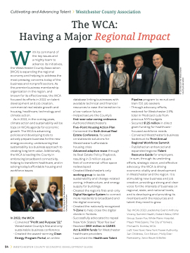 a mighty team to advance its initiatives, the Westchester County Association (WCA) is expanding the regional economy and helping to address the most pressing concerns today of the business and nonprofit sectors. As the premier business membership organization in the region, and known for its effectiveness, the WCA focused its efforts in 2022 on talent development and job creation, commercial real estate growth and housing, healthcare, technology and climate action.