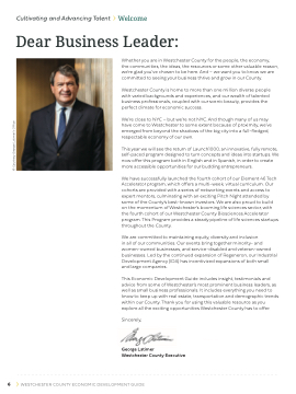 is Economic Development Guide includes insight, testimonials and advice from some of Westchester’s most prominent business leaders, as well as small business professionals. It includes everything you need to know to keep up with real estate, transportation and demographic trends within our County. ank you for using this valuable resource as you explore all the exciting opportunities Westchester County has to offer.