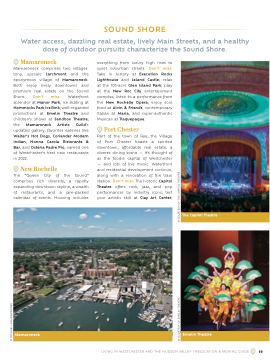 Mamaroneck comprises two villages: tony, upscale Larchmont and the eponymous village of Mamaroneck. Both enjoy lively downtowns and premium real estate on the Sound Shore. Don’t miss: Waterfront splendor at Manor Park; ice skating at Hommocks Park Ice Rink; well-regarded productions at Emelin Theatre and children’s shows at Sandbox Theatre; the Mamaroneck Ar tists Guild’s updated gallery; favorites eateries like Walter’s Hot Dogs, Coriander Modern Indian, Nonna Carola Ristorante & Bar, and Osteria Padre Pio, named one of Westchester’s best new restaurants in 2022.