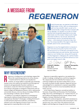 We are proud of our continued commitment to the communities where we work and live. We have both raised our own families here, along with thousands of other Regeneron colleagues who call the Hudson Valley home. We know you will love all that our com- pany and region have to offer.