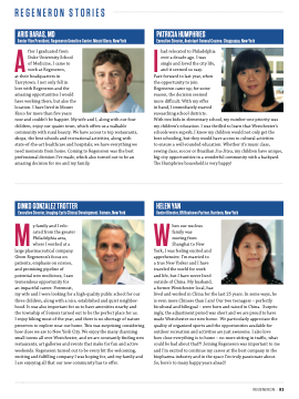lived and worked in China for the last 25 years. In some ways, he is even more Chinese than I am! Our two teenagers – perfectly bicultural and bilingual – were born and raised in China. Surpris- ingly, the adjustment period was short and we are proud to have made Westchester our new home. We particularly appreciate the quality of organized sports and the opportunities available for outdoor recreation and activities are just awesome. I also love how close everything is to home – no more sitting in traffic, what could be bad about that?! Joining Regeneron was important to me and I’m excited to continue my career at the best company in the biopharma industry and in the space I’m truly passionate about. So, here’s to many happy years ahead!