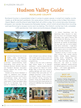 Industries that thrive here include health, retail, manufacturing, pharmaceutical, and research businesses, including Columbia University’s Lamont–Doher ty Ear th Observatory, while groups like the Rockland Business Women’s Network and Rockland Business Association actively suppor t the county’s lively business scene.