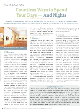 Caramoor Center for Music and the Arts in Katonah is a prime destination for live performances of multiple genres. Nationally acclaimed performers take their bows at other local venues, too, including Tarrytown Music Hall, White Plains Performing Ar ts Center, The Capitol Theatre in Por t Chester, the Paramount Hudson Valley Theater in Peekskill, and West Point’s 4,000-capacity Eisenhower Hall Theatre. The Performing Ar ts Center at Purchase College is home to a wide variety of performing arts acts year-round. Chappaqua Performing Arts Center is a new addition to the region’s enter tainment scene, while the recently refurbished Bedford Playhouse offers various ar t, culture, and film programming.