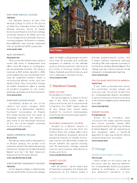 Pace University’s Westchester campus covers 200 acres in Pleasantville and offers some 80 majors to undergradu- ate and graduate students. The campus received a $100 million facelift in 2016, which added two new residential build- ings, an expanded student center, a reconstructed athletic center, and new athletic fields. Pace University’s College of Health Professions offers a variety of excellent programs on the under- graduate, graduate, and doctoral levels. www.pace.edu