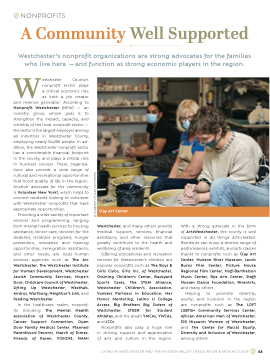 Westchester County’s nonprofit sector plays a critical economic role as both a job creator and revenue generator. According to Nonprofit Westchester (NPW) — an industry group whose goal is to strengthen the impact, capacity, and visibility of the local nonprofit sector — the sector is the largest employer among all industries in Westchester County, employing nearly 54,000 people. In ad- dition, the Westchester nonprofit sector has a considerable financial footprint in the county, and plays a critical role in business success. These organiza- tions also provide a wide range of cultural and recreational opportunities that boost quality of life in the region. Another advocate for the community is Volunteer New York!, which helps to connect residents looking to volunteer with Westchester nonprofits that have appropriate opportunities.