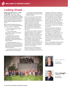 2020 and 2021 were a time of change. The Chester County Chamber, like so many of you, made big plans for both years that fell by the wayside. As our lives move forward and we hopefully leave this pandemic behind, the Chester County Chamber of Business & Industry has been focusing on getting back to a “new” normal.
