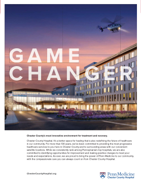 Chester County Hospital. It’s a better space for healing that is also redefining the future of healthcare in our community. For more than 130 years, we’ve been committed to providing the most progressive healthcare services to you here in Chester County and to surrounding areas with our convenient satellite locations. While we consistently rank among Pennsylvania’s top hospitals, we are also committed to identifying opportunities for improvement and making positive changes to meet your needs and expectations. As ever, we are proud to bring the power of Penn Medicine to our community, with the compassionate care you can always count on from Chester County Hospital.