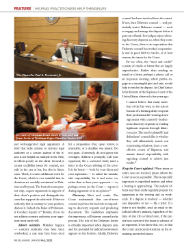 counsel has been involved from the outset. If not, then Delaware counsel — and par- ticularly senior Delaware counsel — need to engage and manage the dispute before it gets out of hand. Few judges enjoy referee- ing discovery disputes; so, when they come to the Court, there is an expectation that Delaware counsel has worked cooperative- ly and in good faith to resolve, or at least narrow, the issues for the Court.