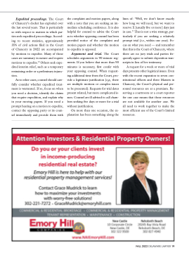 Expedited proceedings. The Court of Chancery’s docket has exploded over the last several years. That is particularly so with respect to matters in which par- ties seek expedited proceedings. Accord- ing to recent statistics, approximately 35% of civil actions filed in the Court of Chancery in 2022 are accompanied by motions to expedite. Many of those cases are summary in nature and require motions to expedite.15 Others seek expe- dited interim relief, such as a temporary restraining order or a preliminary injunc- tion.