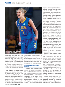 requested an advisory opinion from the Delaware Supreme Court, as permit- ted under the Delaware Code, on the constitutionality of the proposal under Delaware law. The Supreme Court ap- pointed Delaware attorney, and future Chancellor, Andre Bouchard to pres- ent the “affirmative response” and an- other esteemed Delaware lawyer, Law- rence Ashby, to present a “negative response.” Unsurprisingly, the powers in professional and amateur sports took immediate notice of this proposed law. Indeed, the NFL (represented by Ken- neth Nachbar at Morris Nichols Arsht & Tunnell) was permitted to appear and submit an amicus curiae brief in the matter. Just over two months after the Governor’s request, the Delaware Supreme Court rendered an advisory opinion, finding the legislation com- ported with the State’s Constitution.7 (The Governor had already signed the legislation into law two weeks earlier.) The Justices relied heavily on the deci- sion of (now retired) Judge Stapleton. The Governor’s “bet” on a forthcom- ing favorable decision turned out to be a winner. But any glory in victory was very short-lived.
