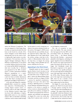 under the Delaware Constitution. The case was assigned to Chief Judge Greg- ory Sleet, an experienced jurist who had been on the bench for a decade. (Two of his colleagues on the federal bench subsequently were in the center of oth- er high-profile legal matters in profes- sional sports. Two years later, in the Los Angeles Dodgers bankruptcy filing in Delaware, Joseph Farnan, Jr. was named to mediate disputes between the Dodg- ers’ owner and the MLB Commissioner. And more recently, Sue L. Robinson was appointed by the NFL Commis- sioner to decide quarterback Deshaun Watson’s punishment in a much- publicized disciplinary matter. One could view these as further illustrations of the First State’s seeming knack for gaining the spotlight in legal matters.)