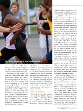 One consequence of Board of Re- gents was that the NCAA no longer controlled the television broadcast con- tract, which led to an increase in tele- vised games and an influx of television money distributed to the conferences and their members. For example, the planned revenue allocation for schools was $180,000 in 1982, the year after the case was initiated. Following the 1984 decision, the value of those me- dia rights escalated significantly. In fis- cal year 2021, Ohio State University received $48.9 million in media rights revenue, with football contributing $36.5 and men’s basketball $12.4 mil- lion. The majority of those funds are the distribution from the Big 10 Con- ference media rights packages with the ESPN and FOX networks.2