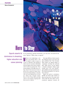 Without over-complicating a com- plex and growing field, it may be helpful to think of esports as a form of competitive video gaming in which teams (or sometimes individuals) match up against other teams or individ- uals for numerous gaming titles. These matches happen at the high school, col- lege and pro levels and can be done in person (as is common for large tourna- ments and championships) or remotely, with each team playing from its home site. Games such as Rocket League, Dota 2, Call of Duty, FIFA and many others are all examples of gaming titles that can serve as esports.