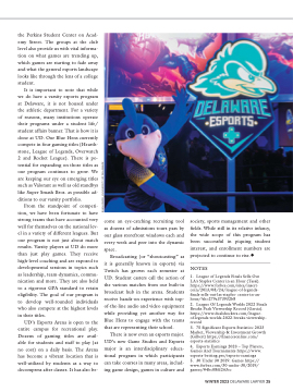 It is important to note that while we do have a varsity esports program at Delaware, it is not housed under the athletic department. For a variety of reasons, many institutions operate their programs under a student life/ student affairs banner. That is how it is done at UD. Our Blue Hens currently compete in four gaming titles (Hearth- stone, League of Legends, Overwatch 2 and Rocket League). There is po- tential for expanding on those titles as our program continues to grow. We are keeping our eye on emerging titles such as Valorant as well as old standbys like Super Smash Bros. as possible ad- ditions to our varsity portfolio.