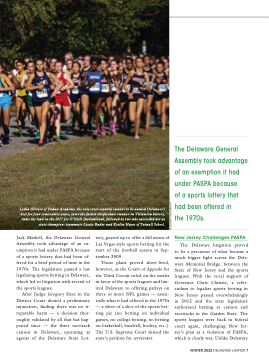 The Delaware litigation proved to be a precursor of what became a much bigger fight across the Dela- ware Memorial Bridge, between the State of New Jersey and the sports leagues. With the vocal support of Governor Chris Christie, a refer- endum to legalize sports betting in New Jersey passed over whelmingly in 2012 and the state legislature authorized betting at casinos and racetracks in the Garden State. The sports leagues were back in federal court again, challenging New Jer- sey’s plan as a violation of PASPA, which it clearly was. Unlike Delaware