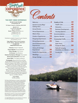 The Deep Creek Experience is Garrett County’s official Visitors & Relocation Guide, produced and distributed as a free publication by Garrett County Chamber of Commerce, Inc. Articles, advertisements and listings appearing in this guide are intended as a service to travelers and do not constitute an endorsement by the Chamber. Information in this publication is as correct as possible at the time of publication, but is subject