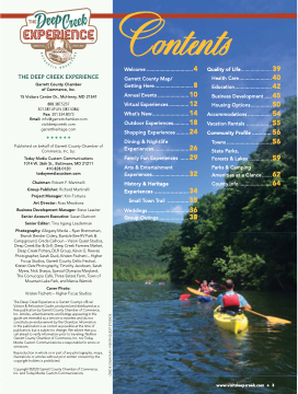 The Deep Creek Experience is Garrett County’s official Visitors & Relocation Guide, produced and distributed as a free publication by Garrett County Chamber of Commerce, Inc. Articles, advertisements and listings appearing in this guide are intended as a service to travelers and do not constitute an endorsement by the Chamber. Information