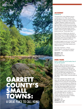 This quaint town north of McHenry got its unusual name in the 1700s. Around 1751, George Deakins received a land grand from King George II, for 600 acres of land anywhere in Western Maryland. Deakins sent out two different groups of engineers to look for the best land. When the two groups returned with their maps, they found they had each surveyed the same tract of land by accident. Hence, Deakins chose the area for settlement and it became known as “The Accident Tract.”