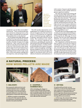 The GFC has supported existing and startup industries that utilize wood bio- mass to generate electricity, produce wood pellets and refine biofuels. “We assist in identifying appropriate sites with ample feedstock supplies and infrastructure,” said GFC SUM Chief Devon Dartnell. “We help startup forest biomass industries with resource and supplier information as well as assistance in obtaining federal grant funding to help cover research and capital expenditure costs.”