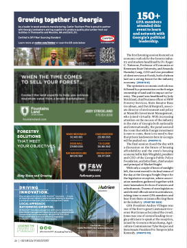 The optimistic economic outlook was followed by a presentation on the foreign ownership of land and its impact on for- estry. The panel was headlined by Jody Strickland, chief business officer at F&W Forestry Services, State Senator Russ Goodman, and David Bergvall, associ- ate director of environment and policy at Manulife Investment Management, who joined virtually. With increasing attention on the success of the industry in the state of Georgia both nationally and internationally, the panel assured the room that while foreign investment is sure to come, there is no need to fear that private landowners here in Georgia will be pushed out. [PHOTO 7]
