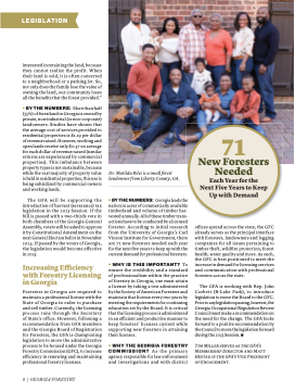 • BY THE NUMBERS: Georgia leads the nation in acres of commercially available timberland and volume of timber har- vested annually. All of these timber trans- actions have to be conducted by a licensed forester. According to initial research from the University of Georgia’s Carl Vinson Institute for Government, there are 71 new foresters needed each year for the next five years to keep up with the current demand for professional foresters.