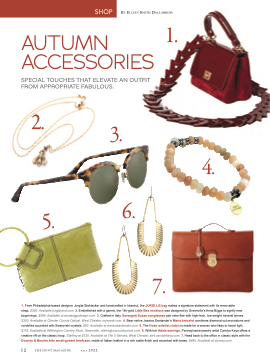 strap. $390. Available jurgibrand.com. 2. Embellished with a garnet, the 14k-gold Little Bee necklace was designed by Greenville’s Anna Biggs to signify new beginnings. $598. Available at annabiggsdesign.com. 3. Crafted in Italy, Serengeti Susan sunglasses pair retro flair with high-tech, low-weight mineral lenses. $350. Available at Chester County Optical, West Chester, myeyedr.com. 4. Bear native Jessica Santander’s Maria bracelet combines diamond-cut moonstone and rondelles accented with Swarovski crystals. $92. Available at jessicasantander.com. 5. The Hobo wristlet clutch is made for a woman who likes to travel light. $118. Available at Wilmington Country Store, Greenville, wilmingtoncountrystore.com. 6. With her Adele earrings, Pennsylvania jewelry artist Carolyn Keys offers a creative riff on the classic hoop. Starting at $120. Available at The 5 Senses, West Chester, and carolynkeys.com. 7. Head back to the office in classic style with the Dooney & Bourke Alto small-gusset briefcase, made of Italian leather in a rich matte finish and accented with brass. $495. Available at dooney.com.