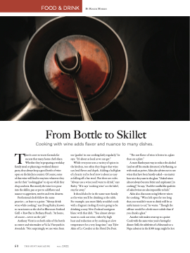 A more flamboyant way to reduce the alcohol (and set off the smoke detectors) is by flaming, as with steak au poivre. Akin also advises not to use wines that have been heavily oaked—no matter how nice they taste in the glass. “Oaked wines almost always become bitter and unpleasant [in cooking],” he says, “And the vanilla-like qualities of oaked wines are also impossible to hide.”