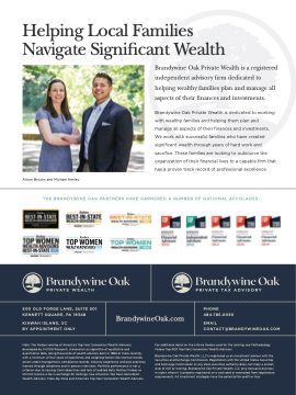 Brandywine Oak Private Wealth is dedicated to working with wealthy families and helping them plan and manage all aspects of their finances and investments. We work with successful families who have created significant wealth through years of hard work and sacrifice. These families are looking to outsource the organization of their financial lives to a capable firm that has a proven track record of professional excellence.