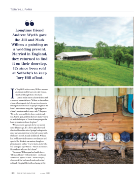 Longtime friend Andrew Wyeth gave the Jill and Mark Willcox a painting as a wedding present. Married in England, they returned to find it on their doorstep. It’s since been sold at Sotheby’s to keep Tory Hill afloat.