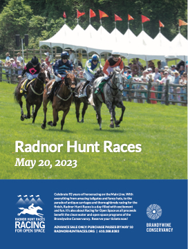 Celebrate 92 years of horseracing on the Main Line. With everything from amazing tailgates and fancy hats, to the parade of antique carriages and thoroughbreds racing for the finish, Radnor Hunt Races is a day filled with excitement and fun. It’s also about Racing for Open Space as all proceeds benefit the clean water and open space programs of the Brandywine Conservancy. Reserve your tickets now!
