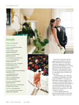 The friends left after a day, and the duo ascended Mount Washington, where John proposed at 6,288 feet. “I remember not expecting it was going to happen,” she says. “I was just so surprised and filled with joy.” The feeling was mutual for John, who’d been continuously checking for the ring in his pack on the hike up. “Then we had to hike back down the mountain before we could call anyone,” says Grace.